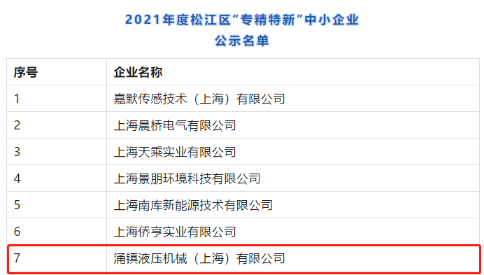 《松江区“专精特新”中小企业发展专项支持实施细则(2020年版)》(沪松经〔2020〕165号),区经委组织开展了2021年度松江区“专精特新”中小企业申报和复核工作。涌镇液压充分发挥自身优势,坚持独立自主的研发与创新设计,凭借高效的产品创新能力和广泛的市场认可度,成功申报并获得上海市松江区“专精特新”的称号。